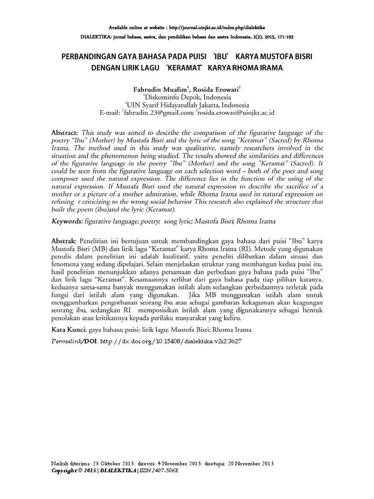 Latar belakang masalah karya sastra adalah suatu kreatifitas untuk menghasilkan karya seni bermediumkan bahasa yang mengandung isi dan nilai keartistikkan. Karya tulisnya banyak tersebar di media massa dan dibukukan, mengupas masalah keislaman, politik, sosial, budaya. Ayah gus mus juga dikenal sebagai seorang orator atau ahli pidato. Tetap saja dada digalau rindu. Puisi tersebut ditempatkan sebagai teks tertulis, di dalamnya terdapat sebersit penawaran pemahaman makna yang dikehendaki penulis. Mustofa bisri (sebuah pendekatan struktural) disusun oleh muh. Data penelitian ini diperoleh dengan cara menganalisis puisi k.h. Mustofa bisri dalam album membaca indonesia dengan menggunakan metode simak dan teknik catat. Ohoi, kumpulan puisi balsem, (2). Assalamualaikum warahmatullahi wabarakatuhnama saya :